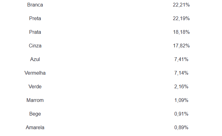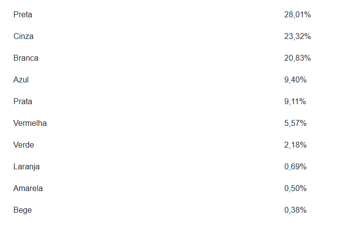 Outras variações básicas surgem na sequência, com preto e branco respondendo por mais de 40%. Opções como azul (9,4%), vermelho (5,5%), verde (2,1%), laranja (0,6%), amarela (0,5%) e bege (0,3%) somadas não chegaram a 20%. Já no mercado de usados, os veículos da cor branca foram os que mais receberam visitas, com 22,2% do total de acessos entre as 10 cores mais requisitadas. Na sequência aparecem preto (28%), prata (18,1%), cinza (17,8%), azul (7,4%), vermelho (7,1%), verde (2,1%), marrom (1%), bege (0,9%) e amarelo (0,8%).