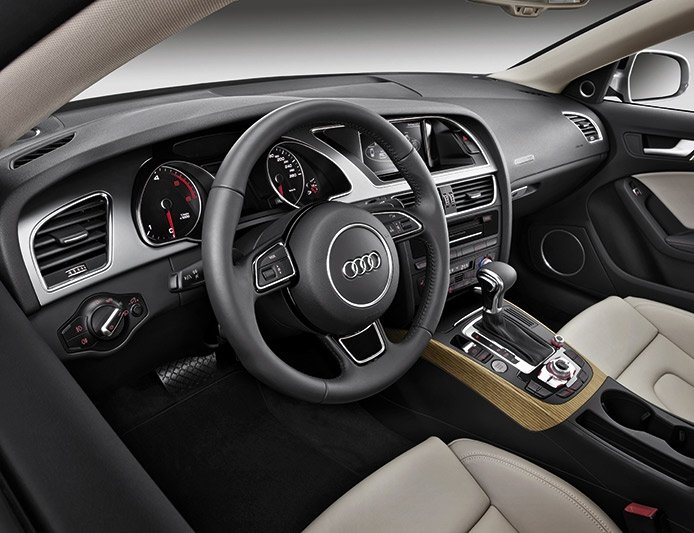 Em relação ao pacote de equipamentos, o A5, na versão Ambiente que guiamos, inclui bancos em couro Milano, (os dianteiros têm ajustes elétricos, inclusive lombar), para-brisa e vidros laterais com isolante térmico, faróis bi-xenônio com luzes diurnas em LEDs e sistema limpador, lanternas traseiras também são em LEDs, rodas de alumínio com 17 polegadas, computador de bordo com display colorido, retrovisor interno antiofuscante automático, sensores de luz e chuva, teto solar e os sistemas Audi connect/Bluetooth e rádio MMI com sistema de navegação.